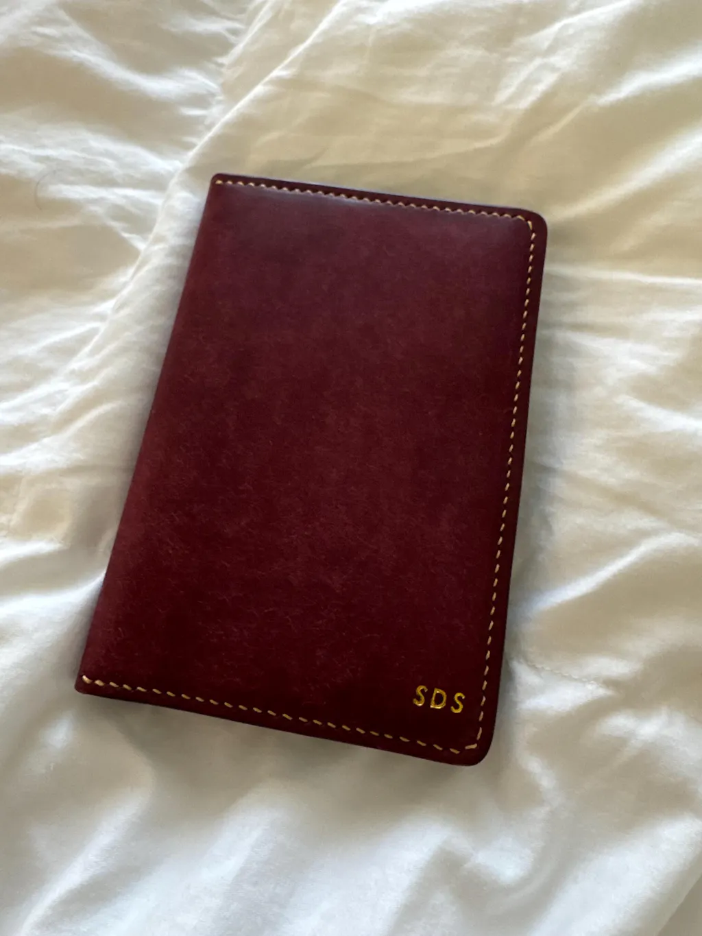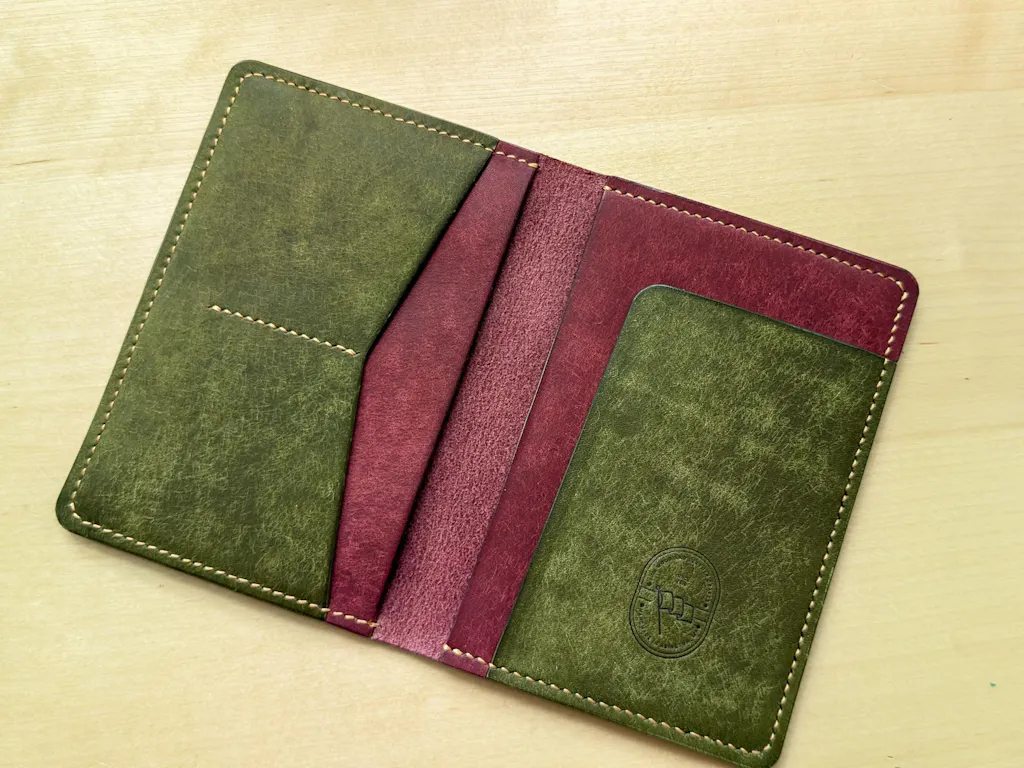This elegant and colorful leather passport holder is made from Badalassi Carlo's Burgundy and Olive Pueblo leather from Italy.