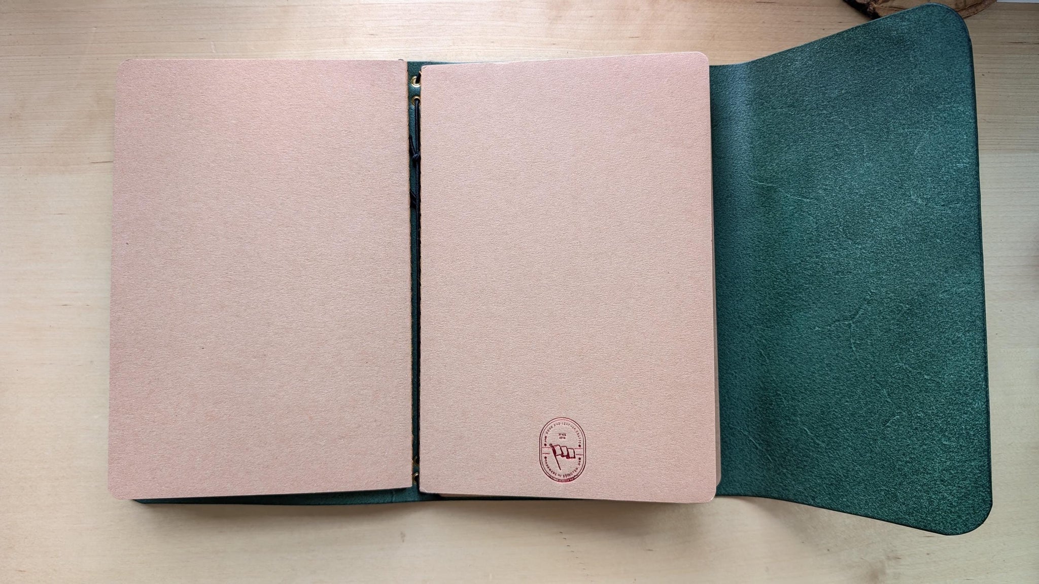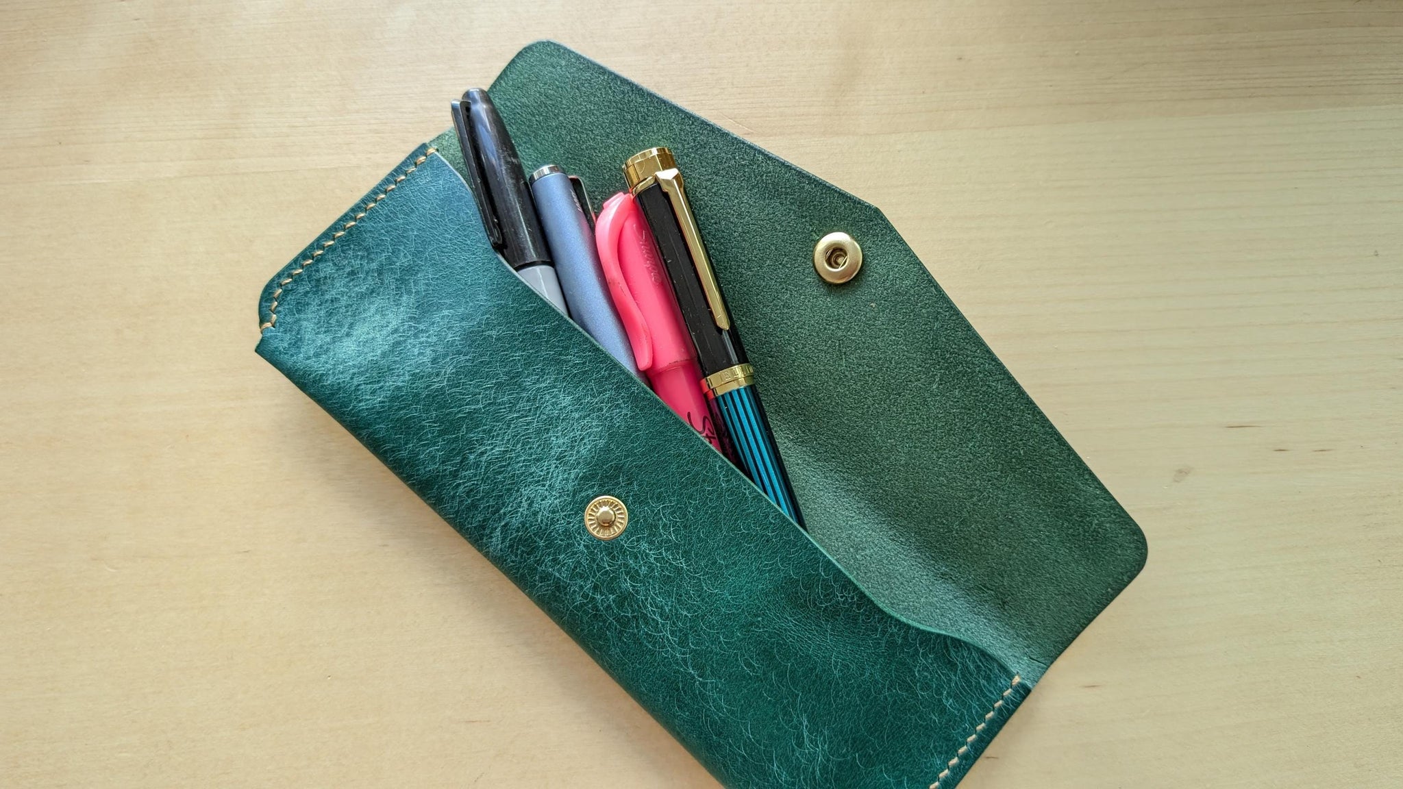 The perfect gift for the writer. A special one of a kind A5 trifold style travel journal with a matching pen/pencil case. This notebook comes with 3 ready to fill notebooks so this gift set is ready to go right away. The matching pen case has room to hold 3+ fountain pens and plenty of pencils. The material is full-grain vegetable-tanned leather in a gorgeous emerald green color.
