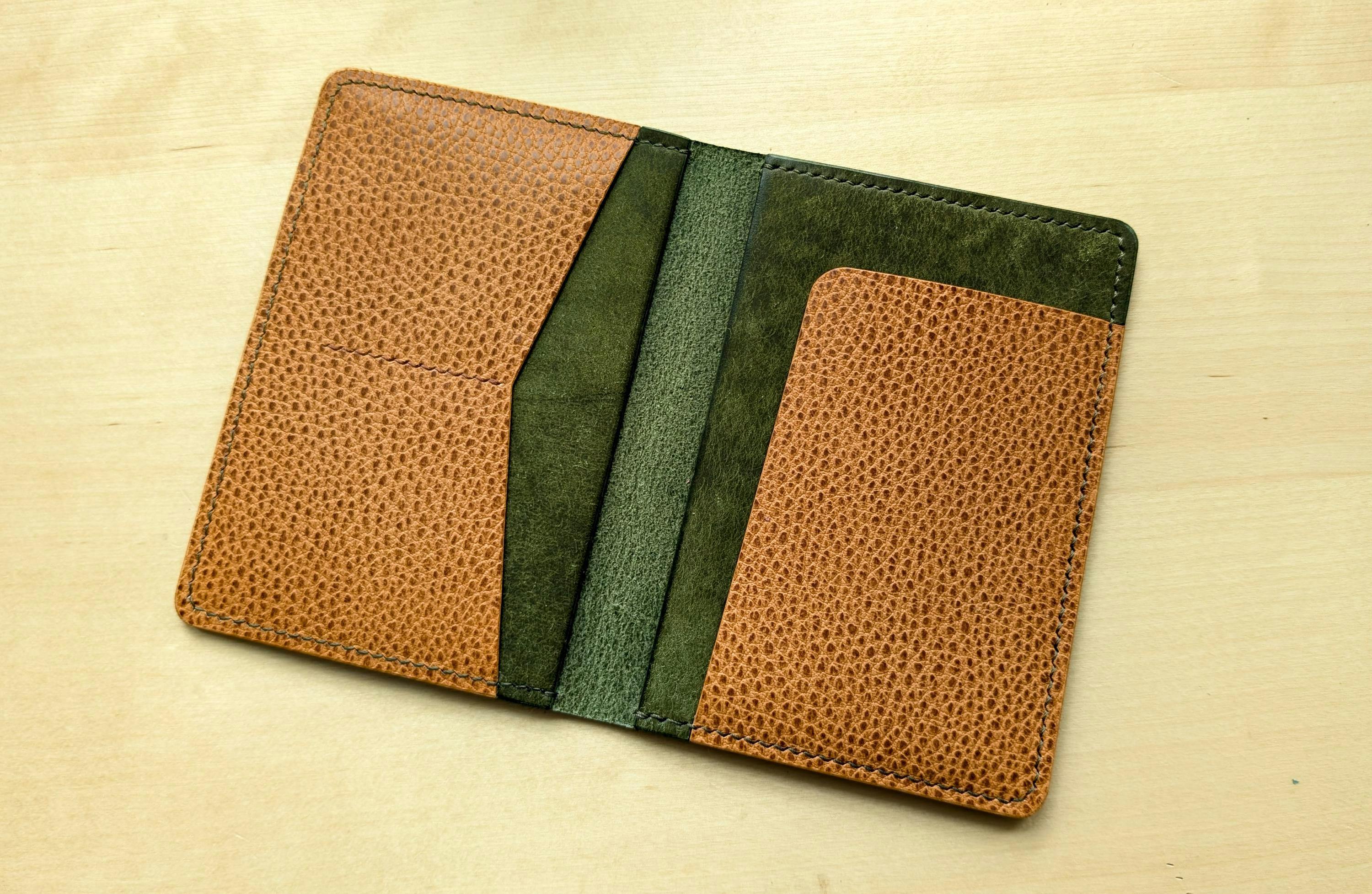 This elegant and colorful leather passport holder is made from Badalassi Carlo's Olive Pueblo and Walpier textured natural Dollaro leather from Italy.